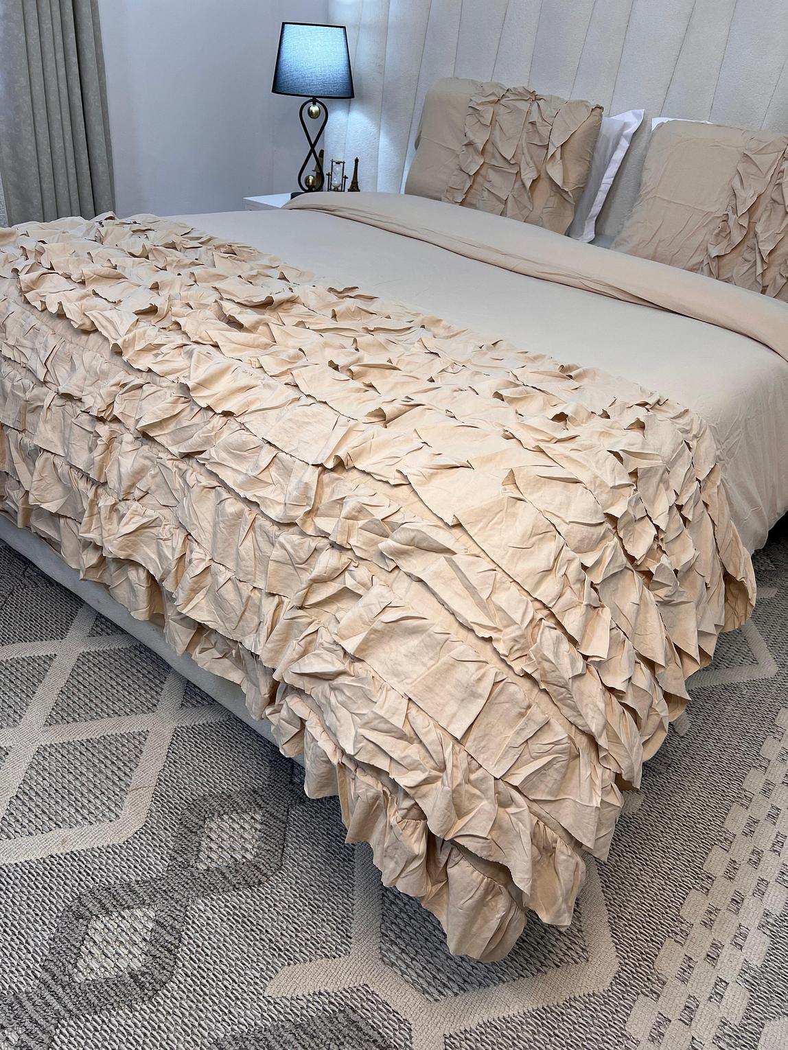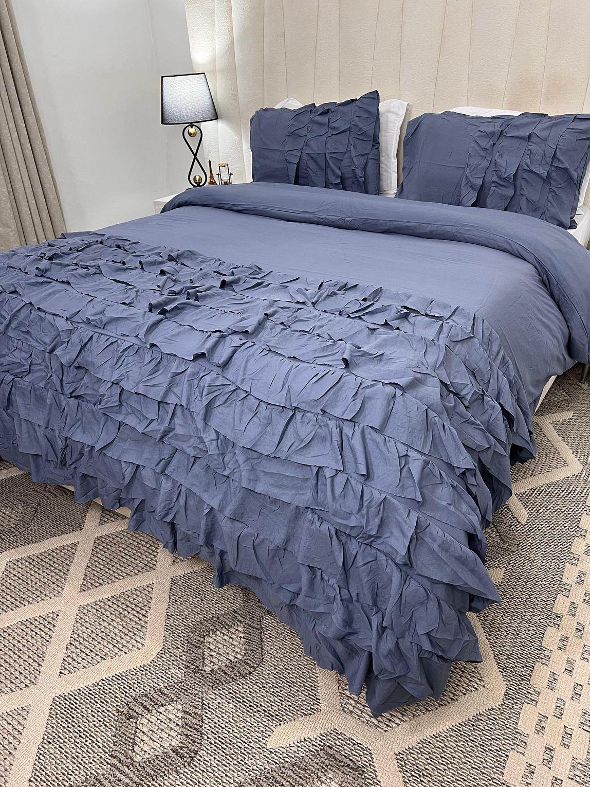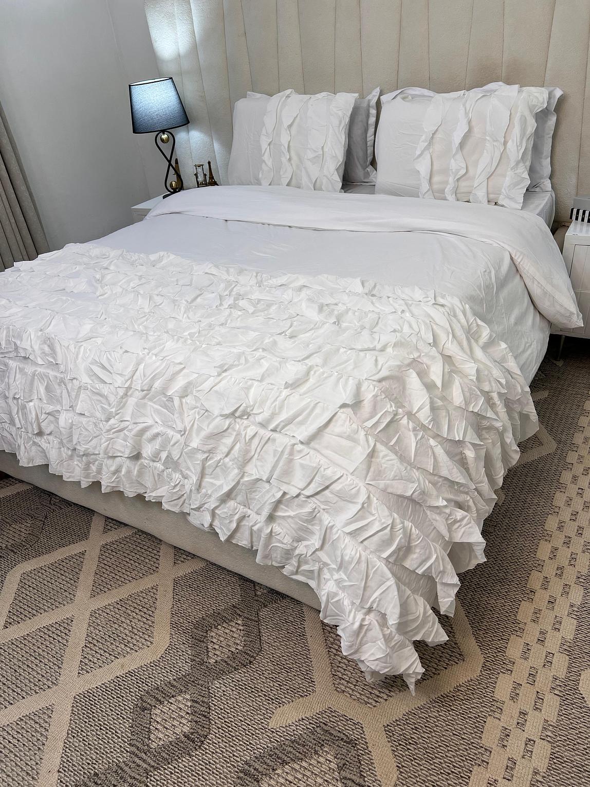Transform your bedroom with this luxurious 3PC Ruffled Duvet Cover Set (6x6 King Size) designed to add softness, elegance, and a romantic touch to your space. The set includes one duvet cover and two matching pillowcases, all detailed with a stunning layered ruffled texture that creates a rich, sophisticated look.