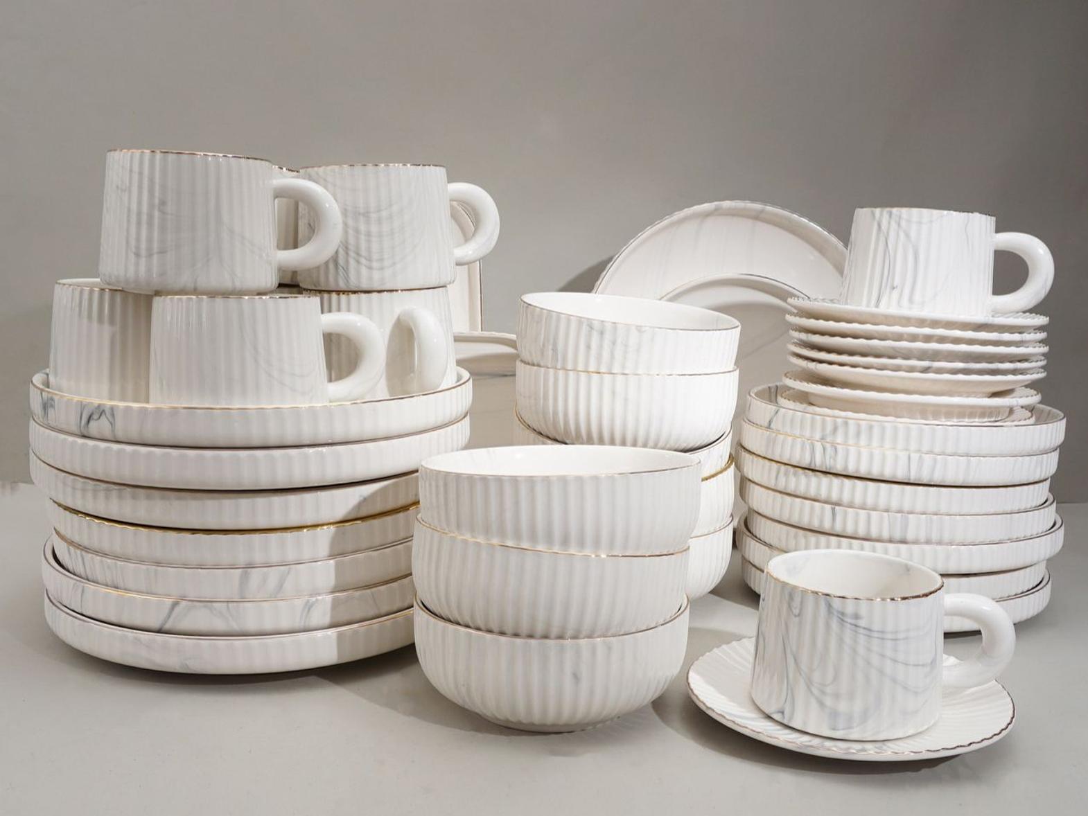 Elevate your dining experience with this 42pcs European-style porcelain dinner set, crafted from premium porcelain for a blend of durability and elegance. The set includes 8 dinner plates, 8 side plates, 8 soup bowls, 8 mugs, 8 cup saucers, and 2 rectangular platters, providing everything you need for both daily meals and hosting special occasions. Its refined European design brings timeless charm to your table setting, while the high-quality finish ensures long-lasting beauty.
