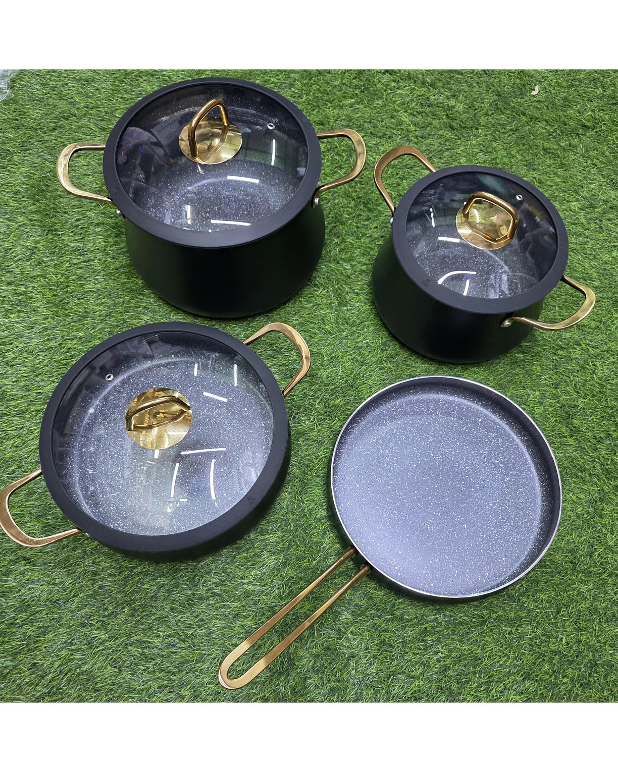 Upgrade your kitchen with this 7-piece high quality non-stick aluminium cookware set, designed for efficient, healthy and hassle-free cooking. Made with premium granite non-stick coating, the pots and pan are scratch-resistant, easy to clean and allow you to cook with minimal oil. The induction-compatible bottom ensures fast, even heat distribution on all cooktops, including gas, electric and induction.