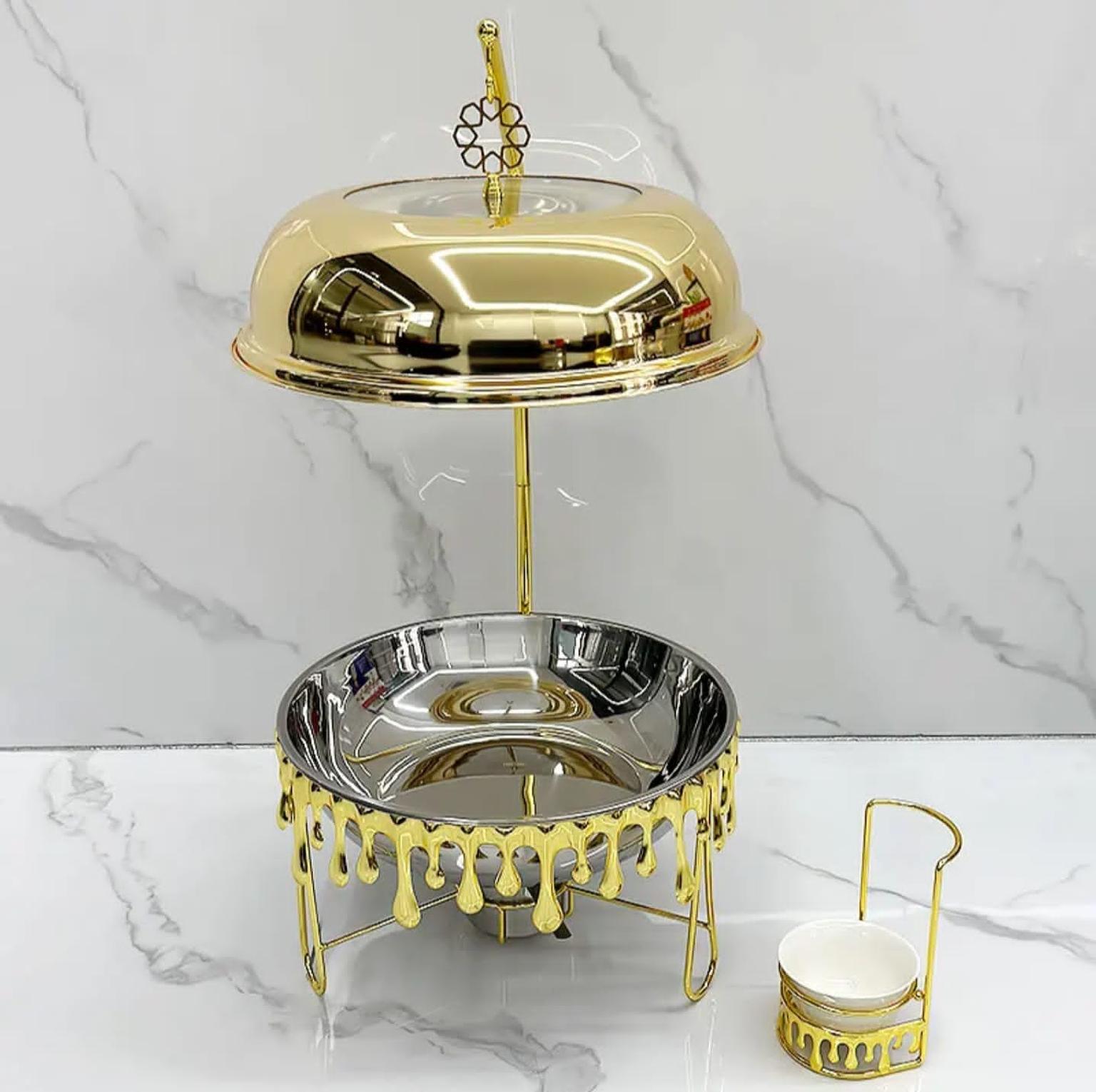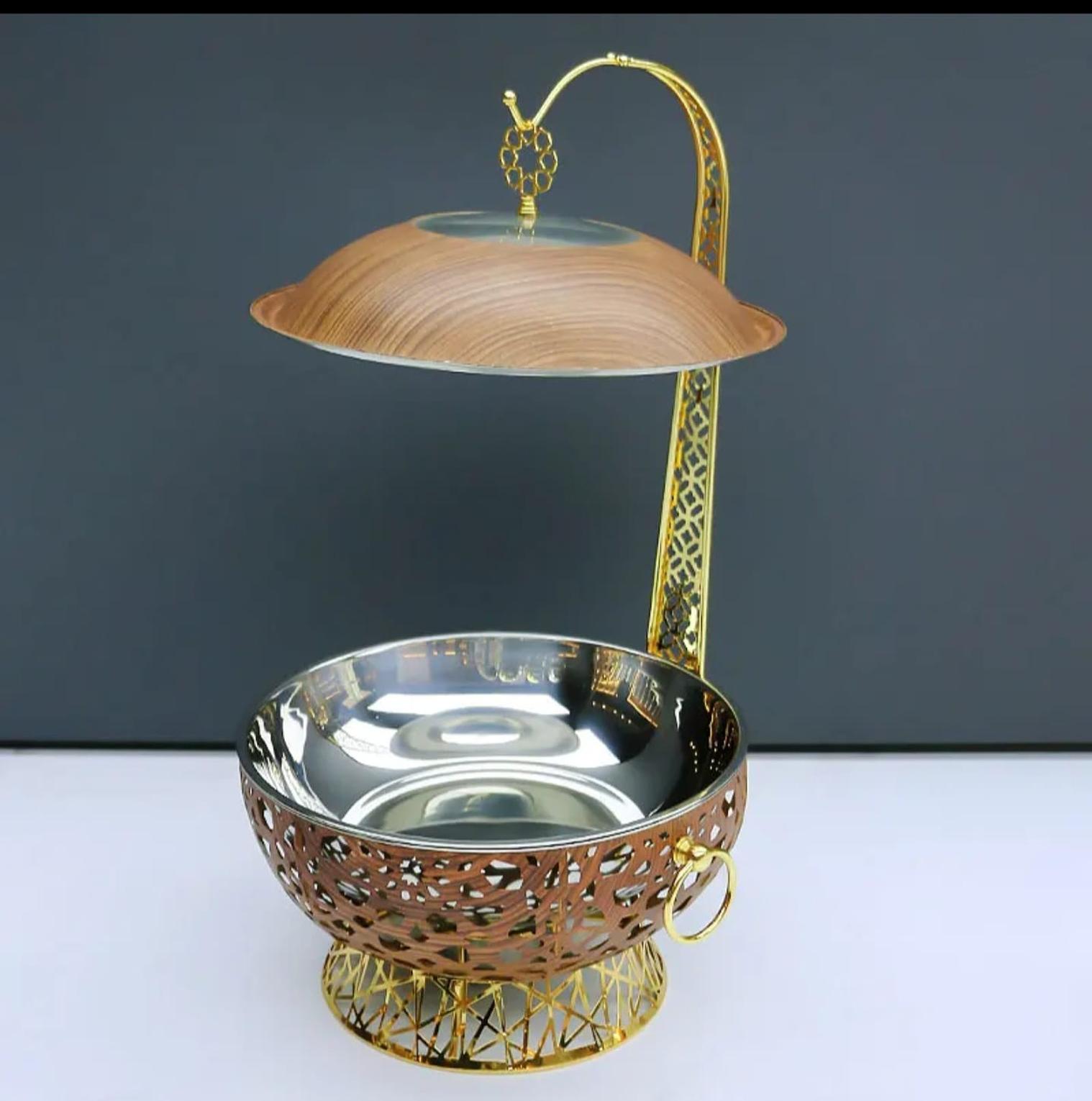Serve your meals in style with this elegant, luxurious hanging chaffing dish, designed to elevate any dining or buffet setup. Comes with a transparent lid cover for easy viewing and a bottom heating stove to keep your food warm throughout your event.