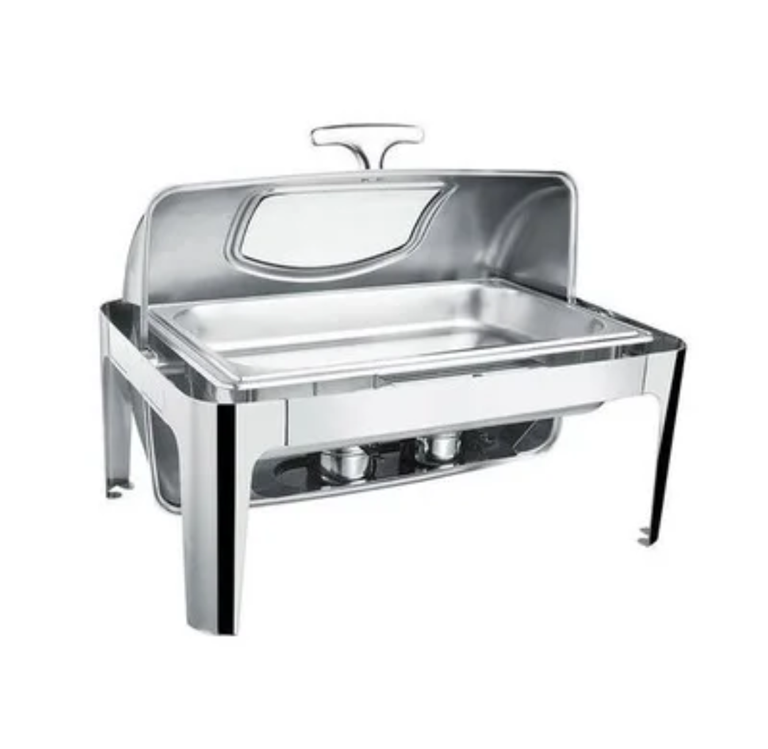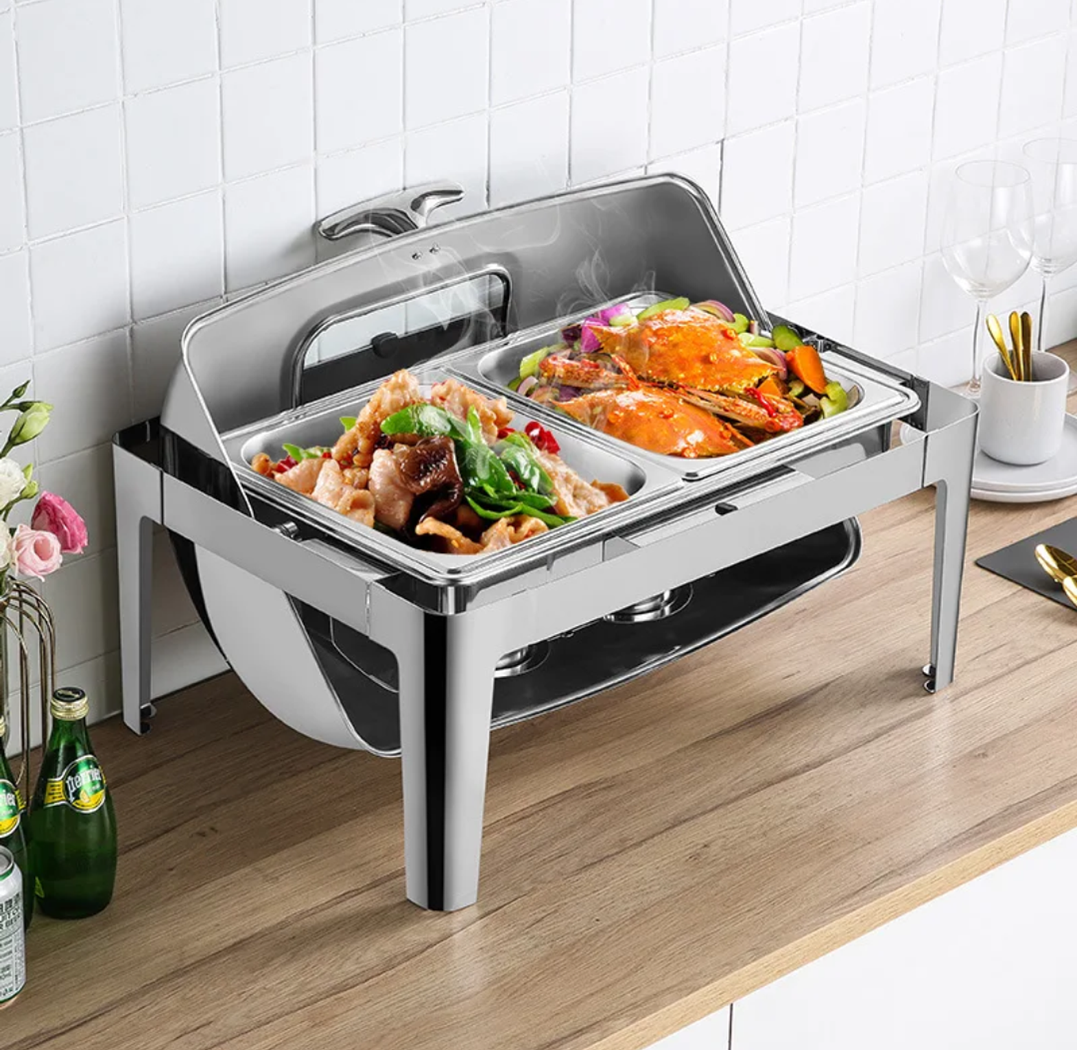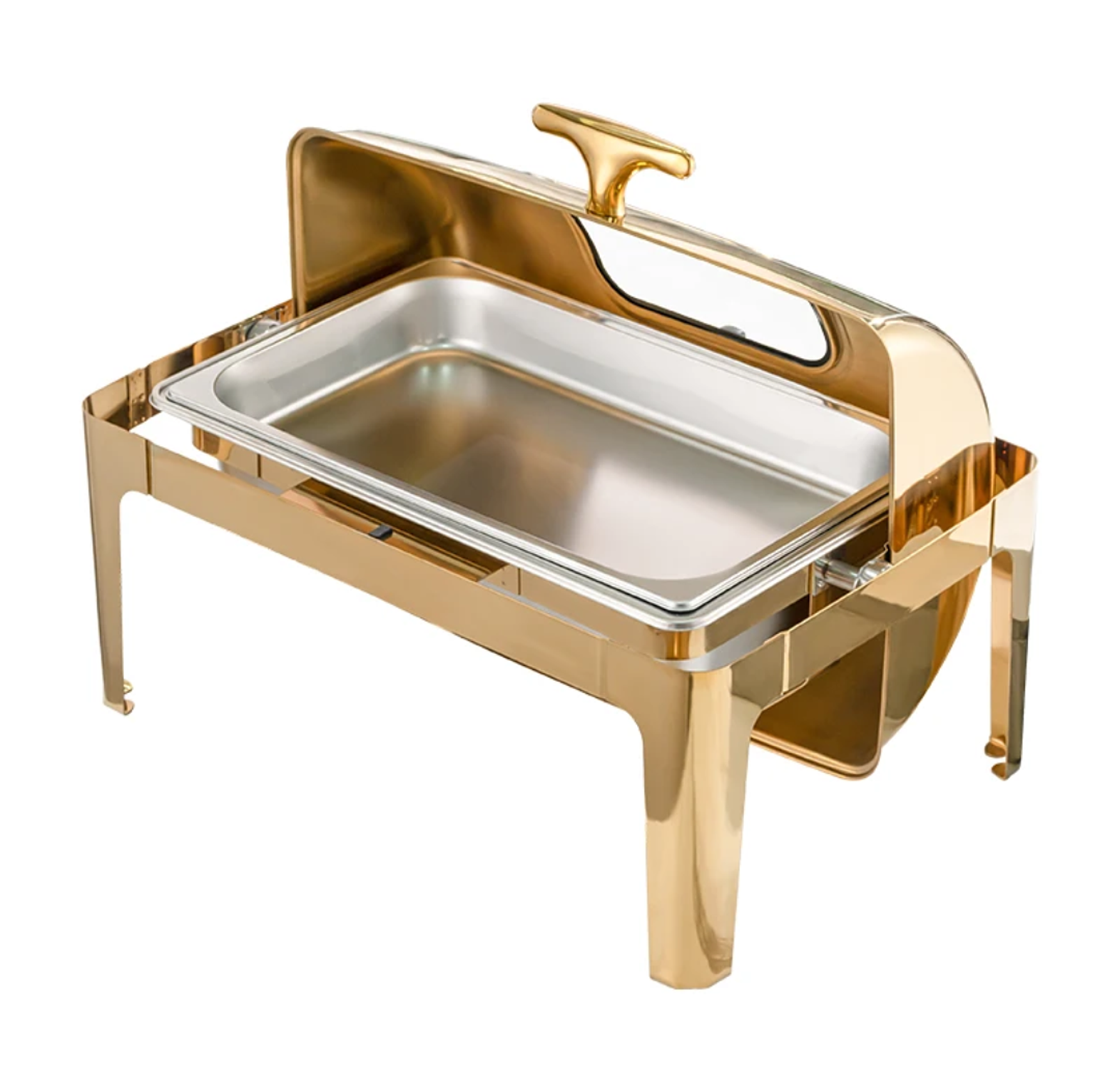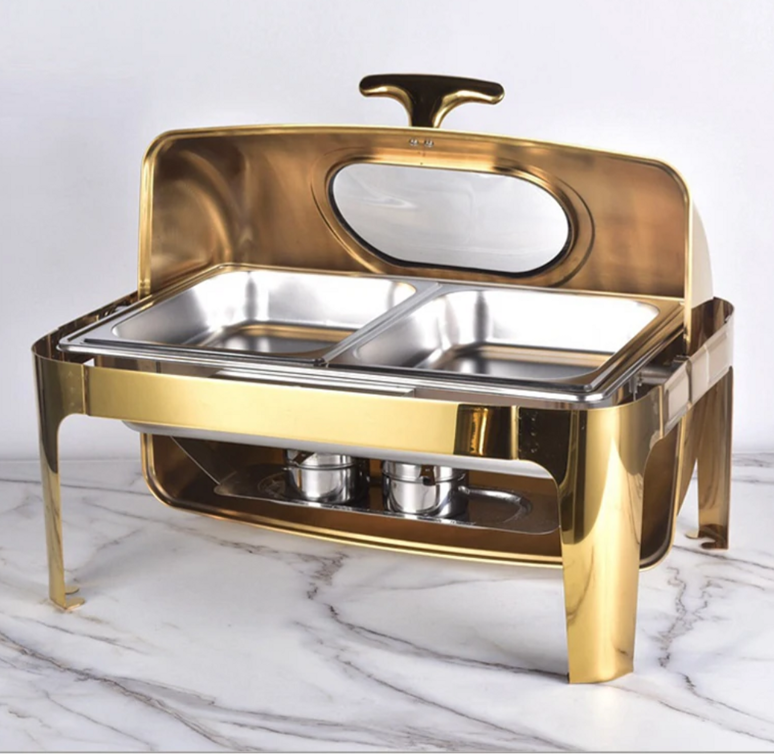 Upgrade your buffet setup with this 9 litre roll top chafing dish, designed for smooth, convenient food service and elegant presentation. The roll-top rotating lid allows easy access from both sides, making it perfect for high-traffic buffet lines. Crafted from high-quality stainless steel, it offers excellent heat retention to keep food warm for longer. Available in luxurious gold and classic silver finishes, and with single or double inserts, this chafing dish is ideal for hotels, catering services, weddings, parties, and corporate events.