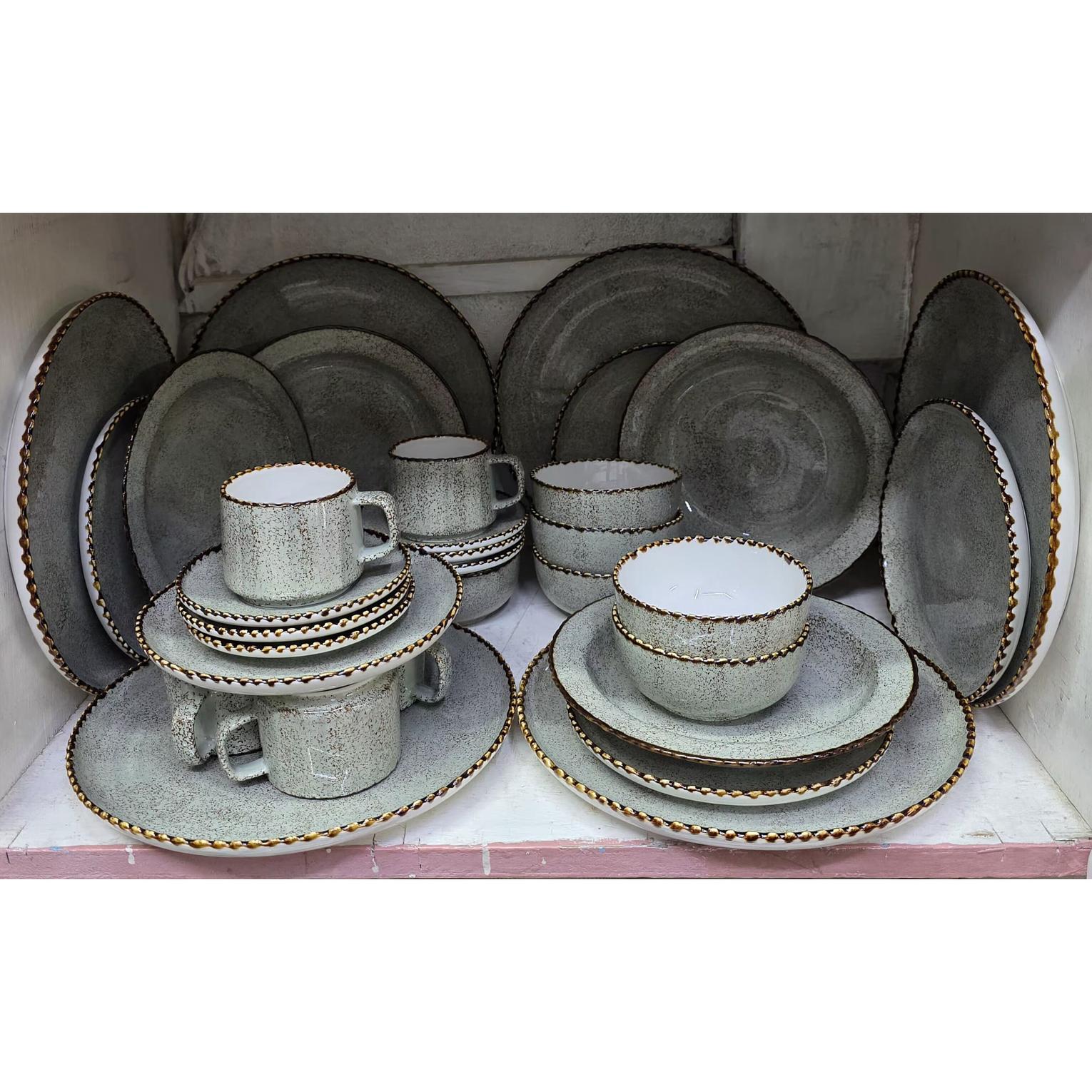 Bring sophistication to your table with this 36-Piece European Kiln Luxury Porcelain Dinner Set, crafted with premium-quality porcelain and a beautifully textured kiln-glazed finish. The subtle speckled surface paired with elegant gold-rim accents delivers a refined, upscale look inspired by classic European dining aesthetics.