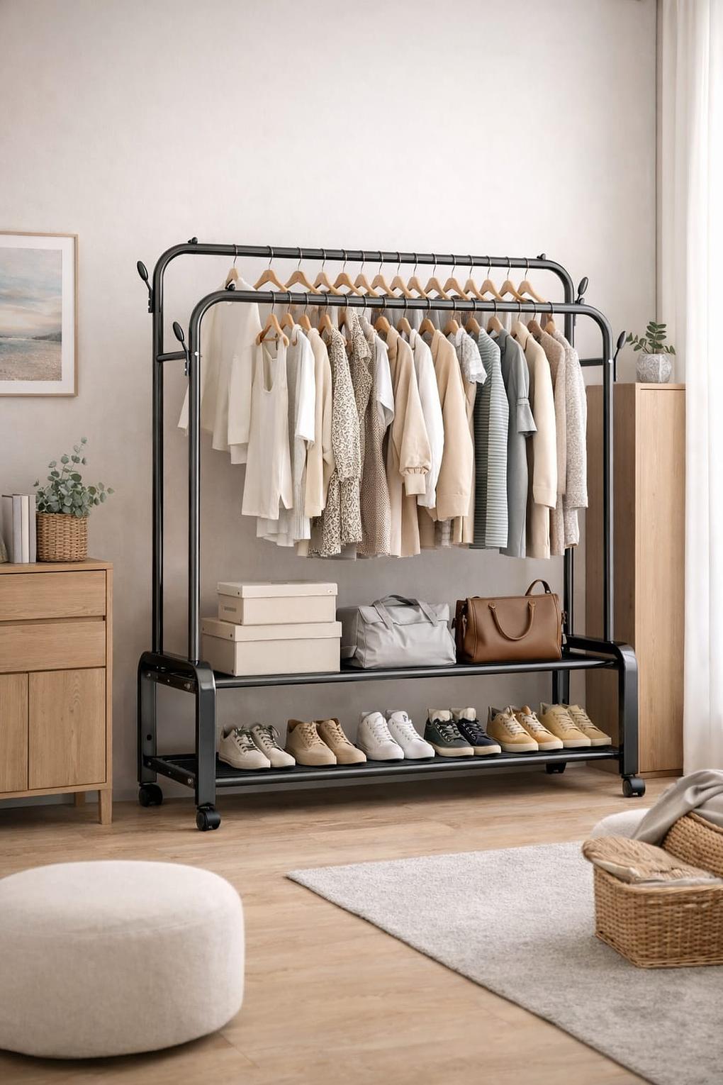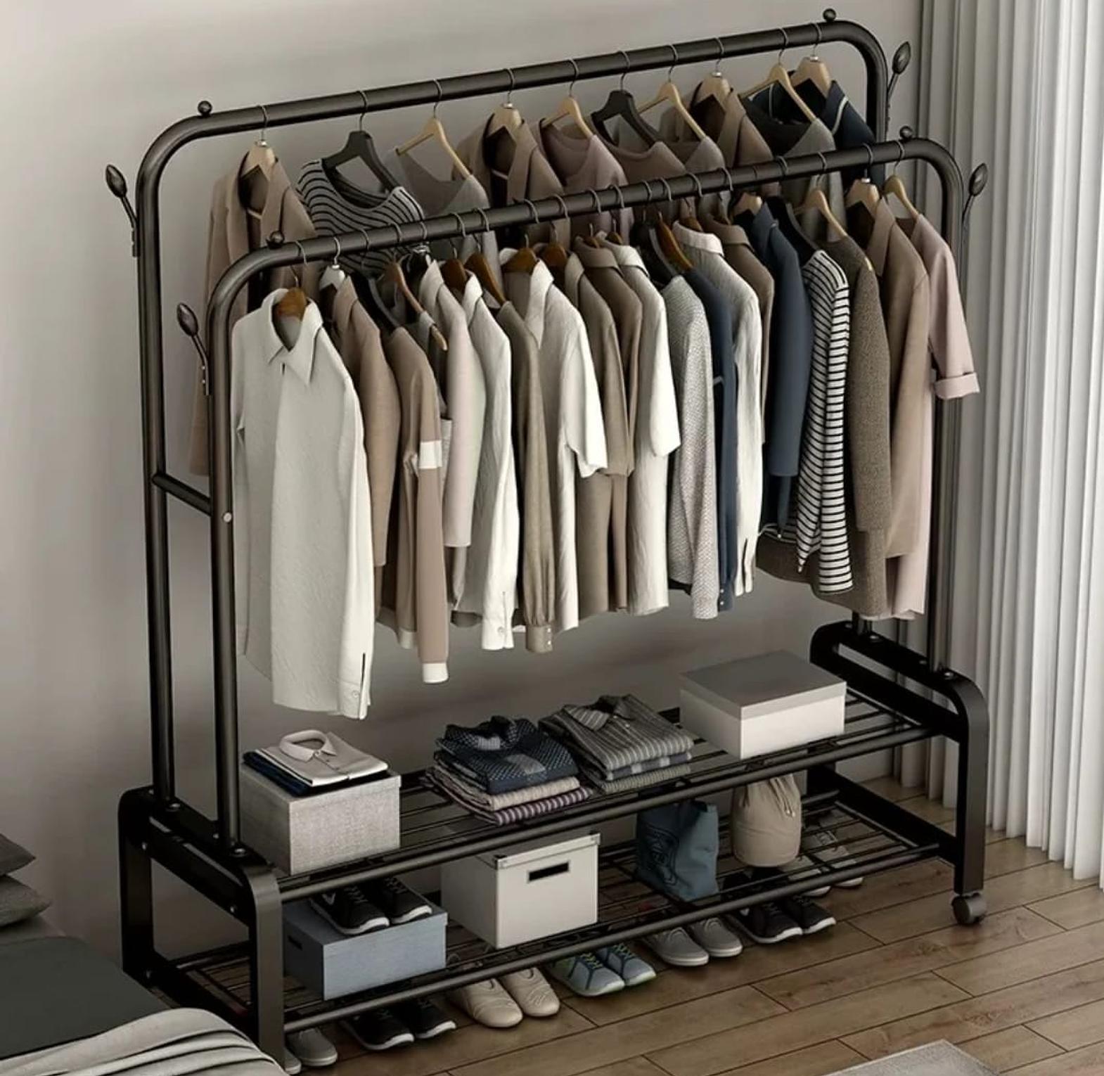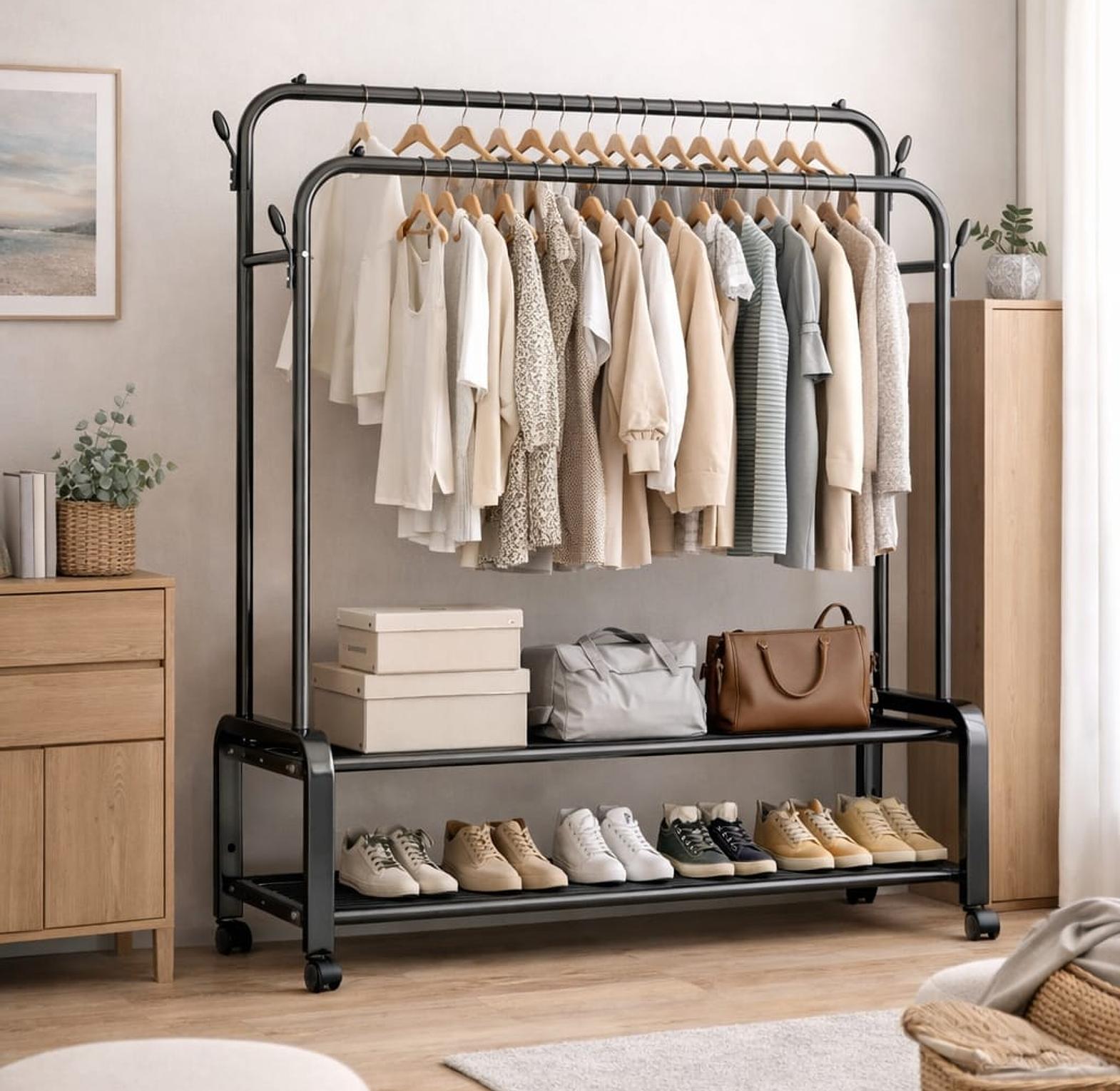 Organize your clothes and accessories efficiently with this heavy-duty double rail clothes rack, designed for both home and commercial use. Built with a strong metal frame, it offers excellent stability and long-lasting durability for everyday use. The double hanging rails provide ample space for coats, dresses, shirts, and trousers, while the bottom storage shelves are perfect for shoes, storage boxes, handbags, or folded items. Equipped with smooth-rolling wheels, the rack is easy to move and reposition, making it ideal for bedrooms, walk-in closets, boutiques, and stores.