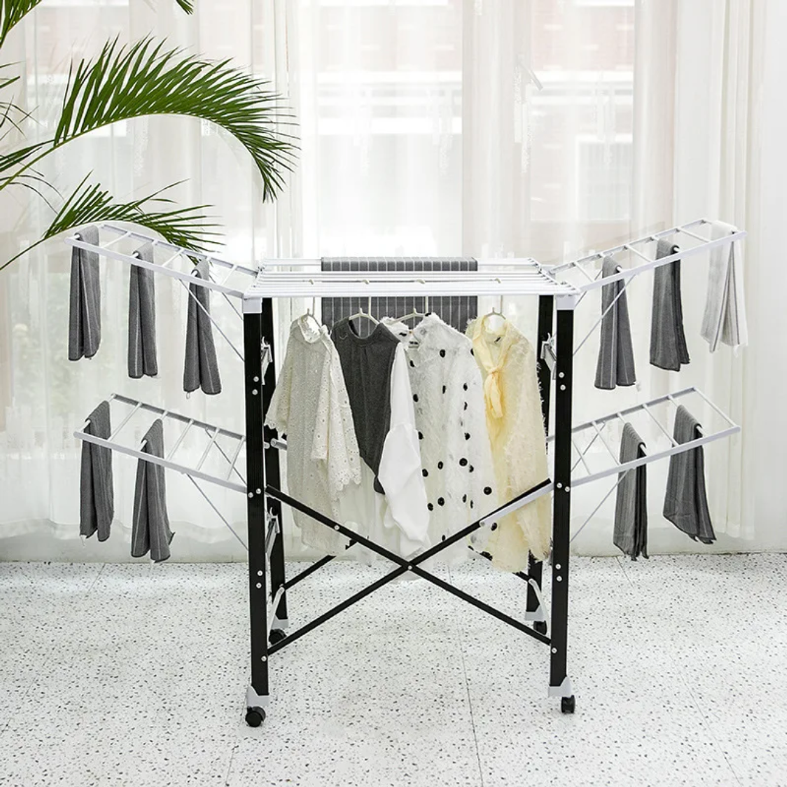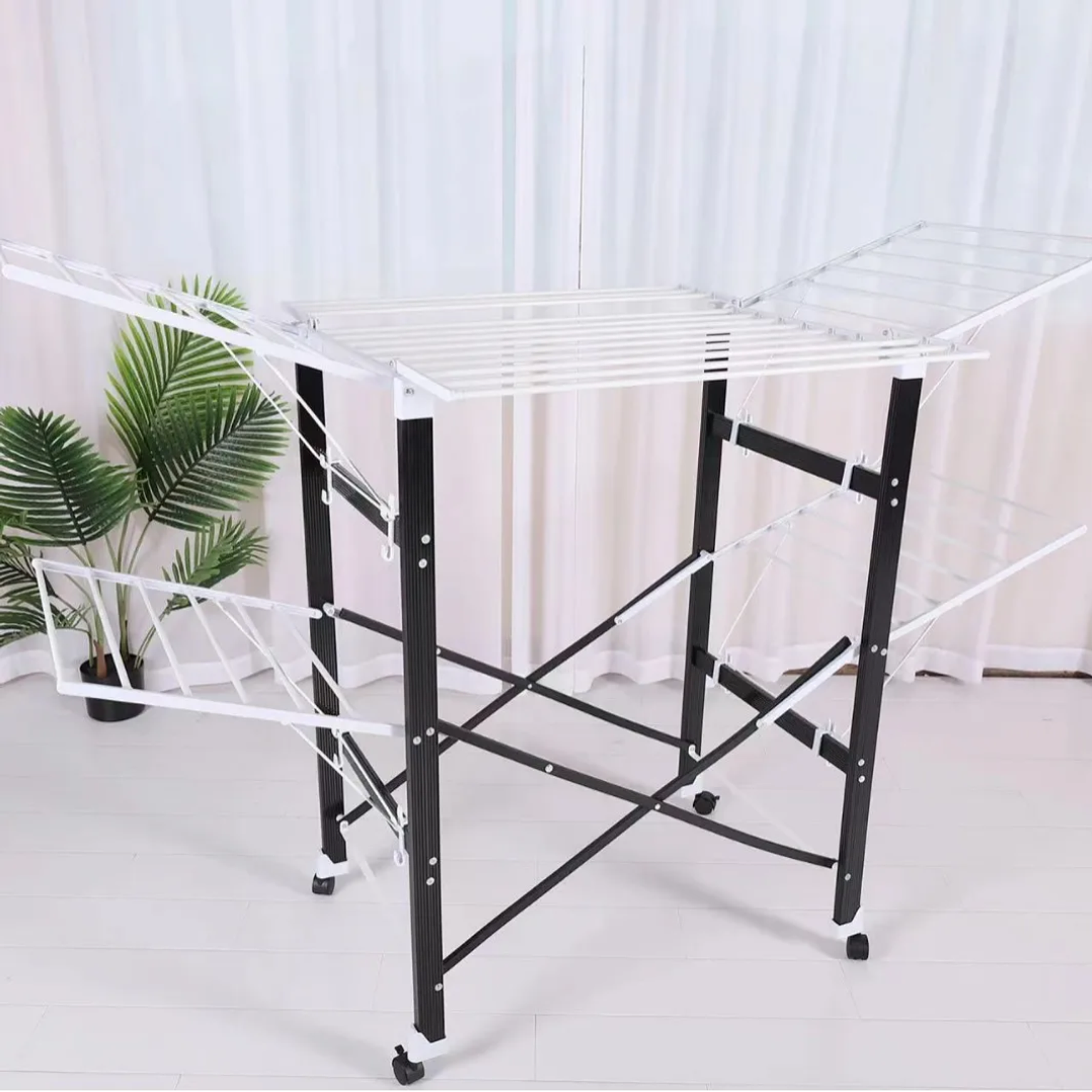The Heavy-Duty Foldable Wing Clothes Drying Rack with Wheels offers a practical and sturdy solution for drying laundry efficiently. Designed with adjustable wings for extra hanging space and smooth-rolling wheels for easy mobility, this rack is ideal for households of all sizes. It folds flat for convenient storage when not in use, making it perfect for apartments, balconies, or laundry rooms. Crafted from rust-resistant steel, it ensures durability and stability even with heavy loads. Whether for everyday clothes, beddings, or delicates, this drying rack delivers reliable performance and effortless convenience.