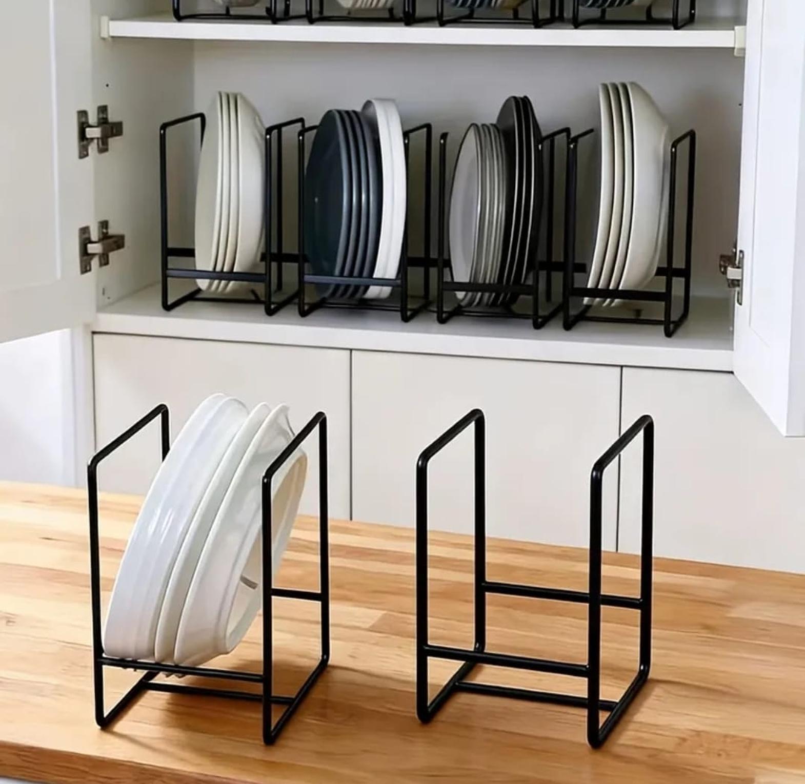Keep your kitchen tidy and well-organized with this Heavy-Duty Metal Plate Holder, built from durable metal for long-lasting everyday use. Its sturdy, well-spaced slots securely hold dinner plates, pot lids, pans, chopping boards, or trays, making it a practical storage solution for countertops, cabinets, or shelves. The open design allows easy access while promoting proper air circulation for drying, making it ideal for both home kitchens and commercial use.