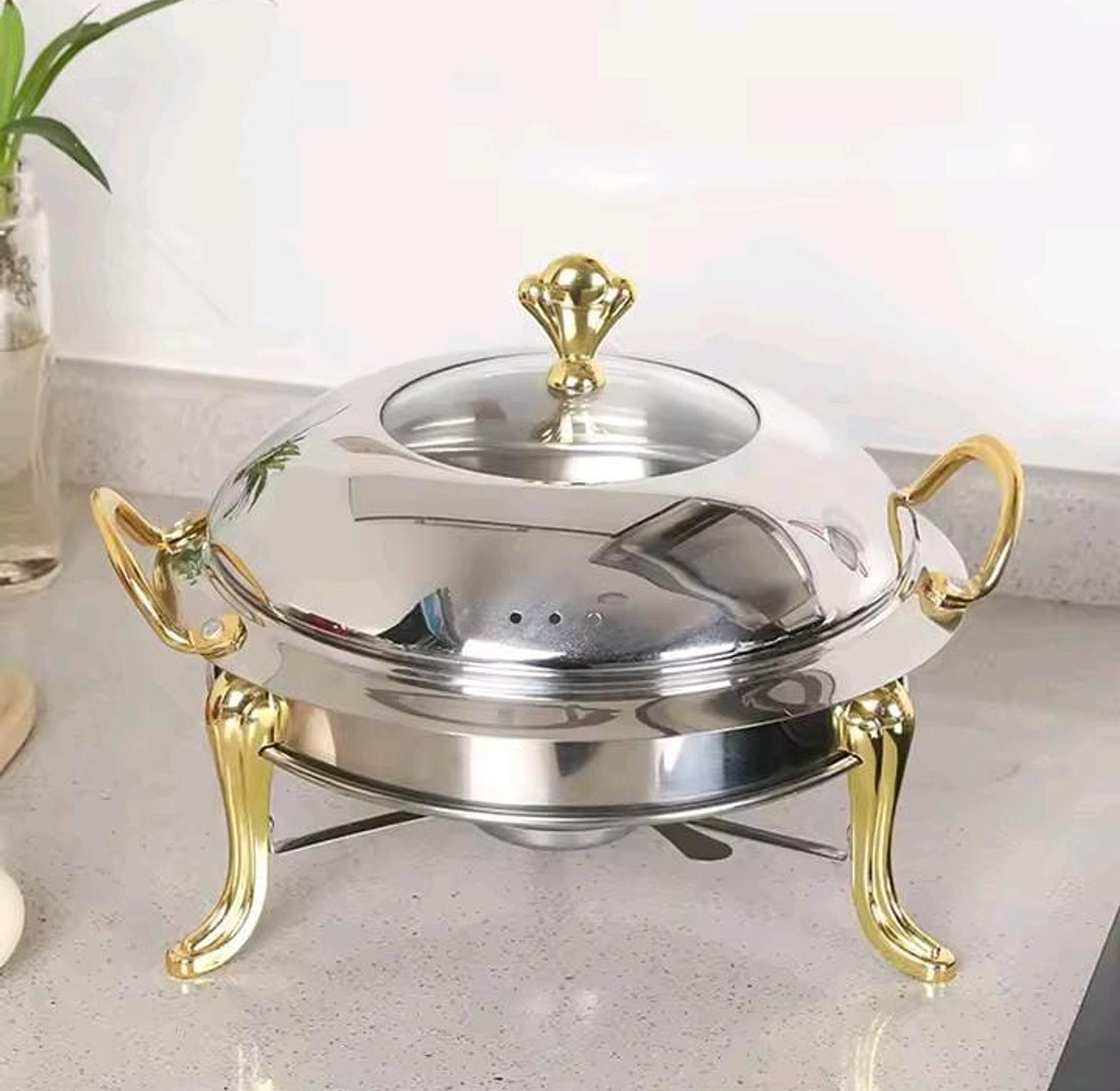 This Round Stainless Steel Buffet Food Warmer / Chafing Dish is crafted from high-quality stainless steel with a polished mirror finish and stylish gold-accented handles and legs. Designed for both functionality and presentation, it keeps food warm for extended periods, making it ideal for buffets, catering events, parties, hotels, and home entertaining. The sturdy stand ensures stability, while the round shape allows for easy serving and heat distribution. Its classic yet modern design makes it a standout piece on any dining or buffet setup.