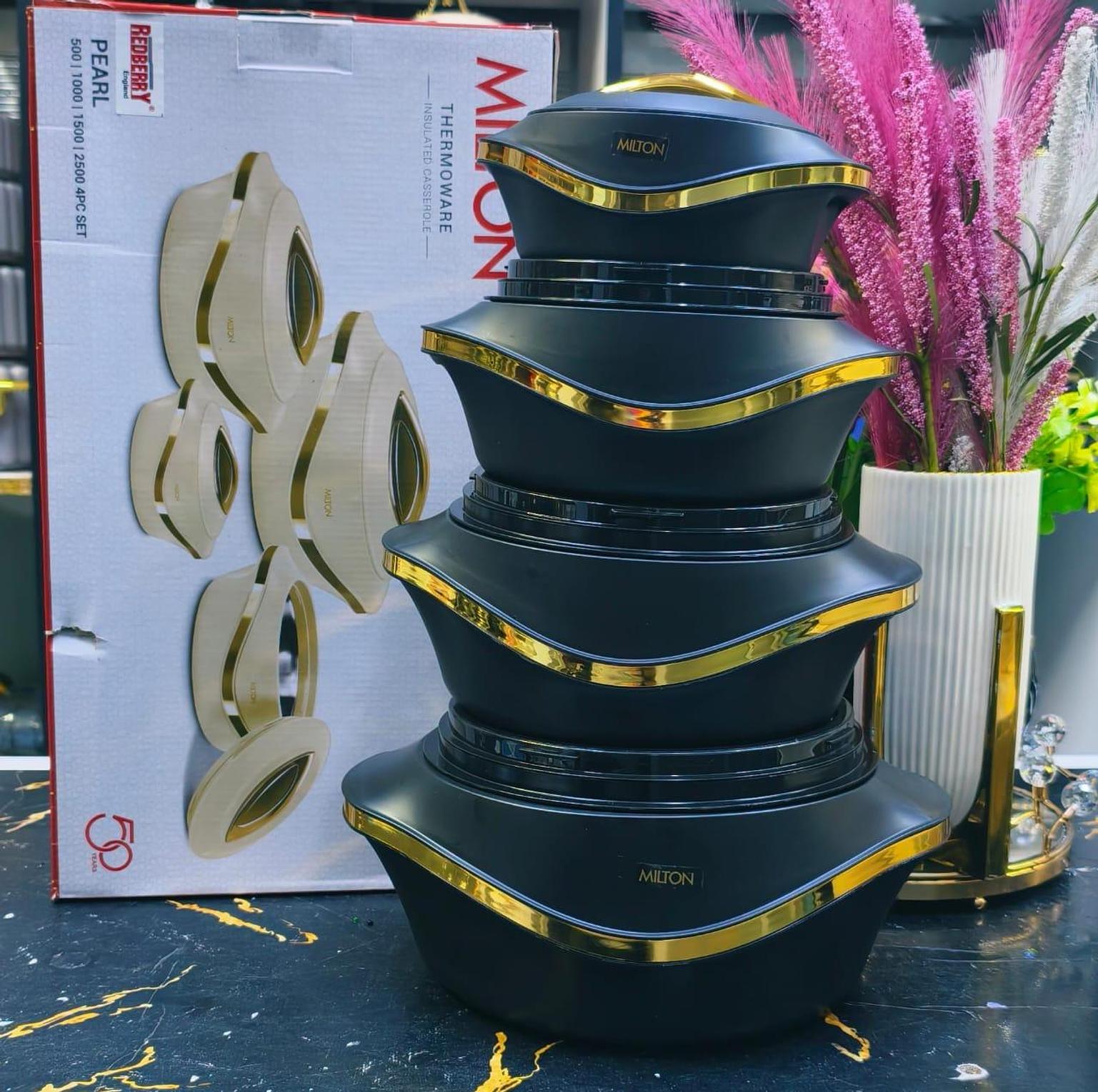 Keep your meals hot, fresh and ready to serve with this elegant 4PCS MILTON Hotpot Set. Designed with a sleek cream finish and gold detailing, these insulated food casseroles are perfect for modern kitchens and stylish serving. ▫️Set includes 4 insulated hotpots ▫️Capacities: 500ml, 1000ml, 1500ml & 2500ml ▫️High-quality thermoware insulation to retain heat longer ▫️Strong, durable outer body ▫️Tight-fitting lids to lock in freshness ▫️Lightweight & easy to carry ▫️Elegant design perfect for table serving Ideal for everyday home use, family dinners, gatherings, catering, and special occasions. A practical and stylish food storage solution for keeping rice, stews, chapati, vegetables and more warm for hours.
