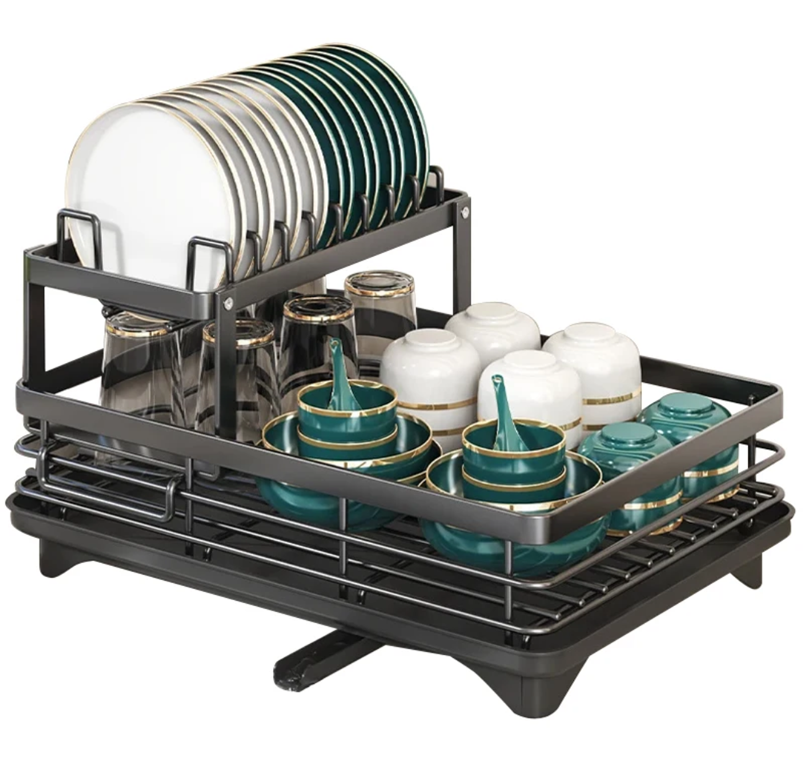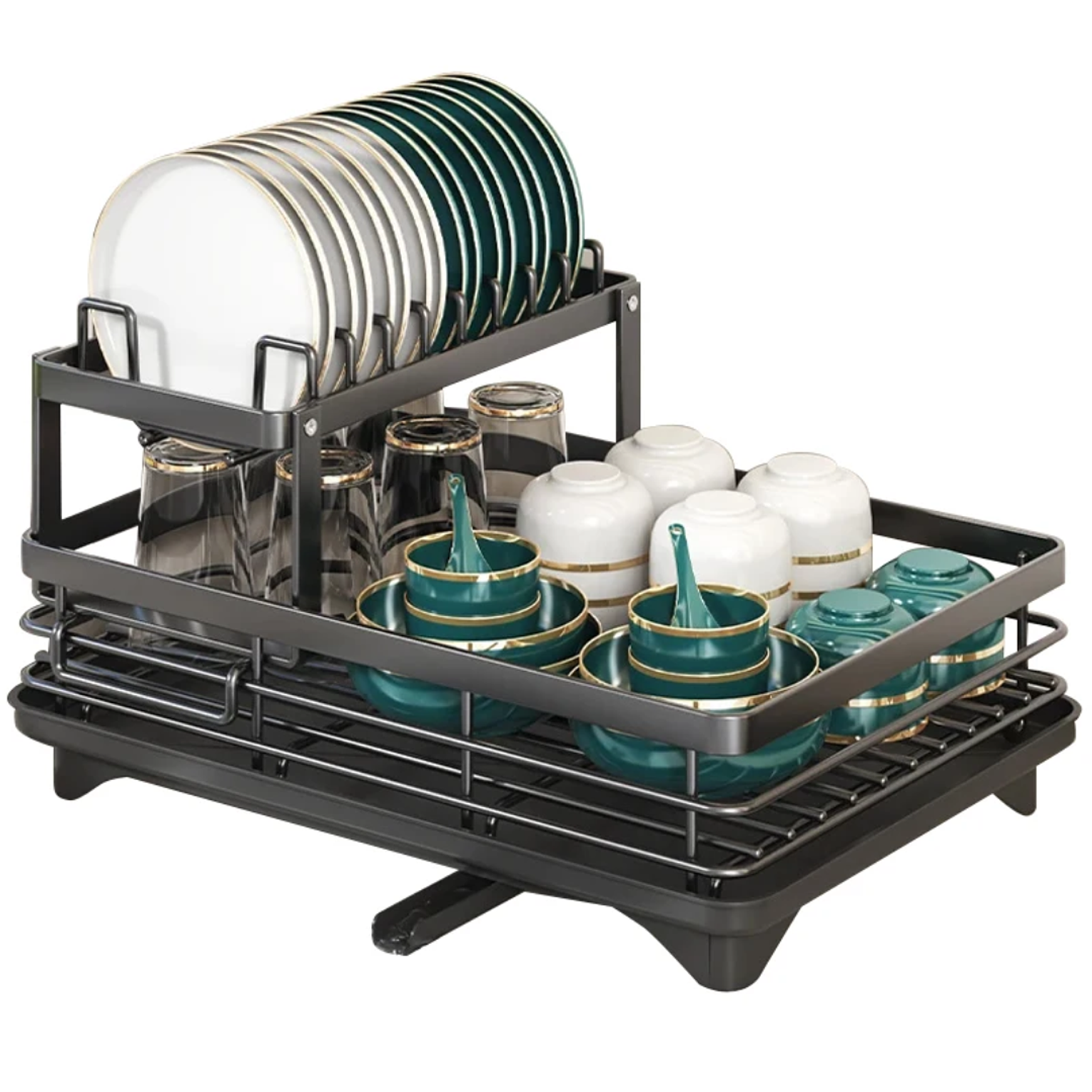 This two-tier metallic dish rack is built for efficiency and durability, providing ample space to dry plates, bowls, utensils, and cups in a compact footprint. Constructed from rust-resistant metal with a sleek finish, it withstands daily use while maintaining its clean, modern appearance. The dual-tier design optimizes vertical space, making it perfect for kitchens with limited counter room, while the integrated drip tray helps contain water and keep surfaces dry. Whether you prefer a traditional setup or a contemporary look, this dish rack brings practical organization and long-lasting functionality to your kitchen routine.