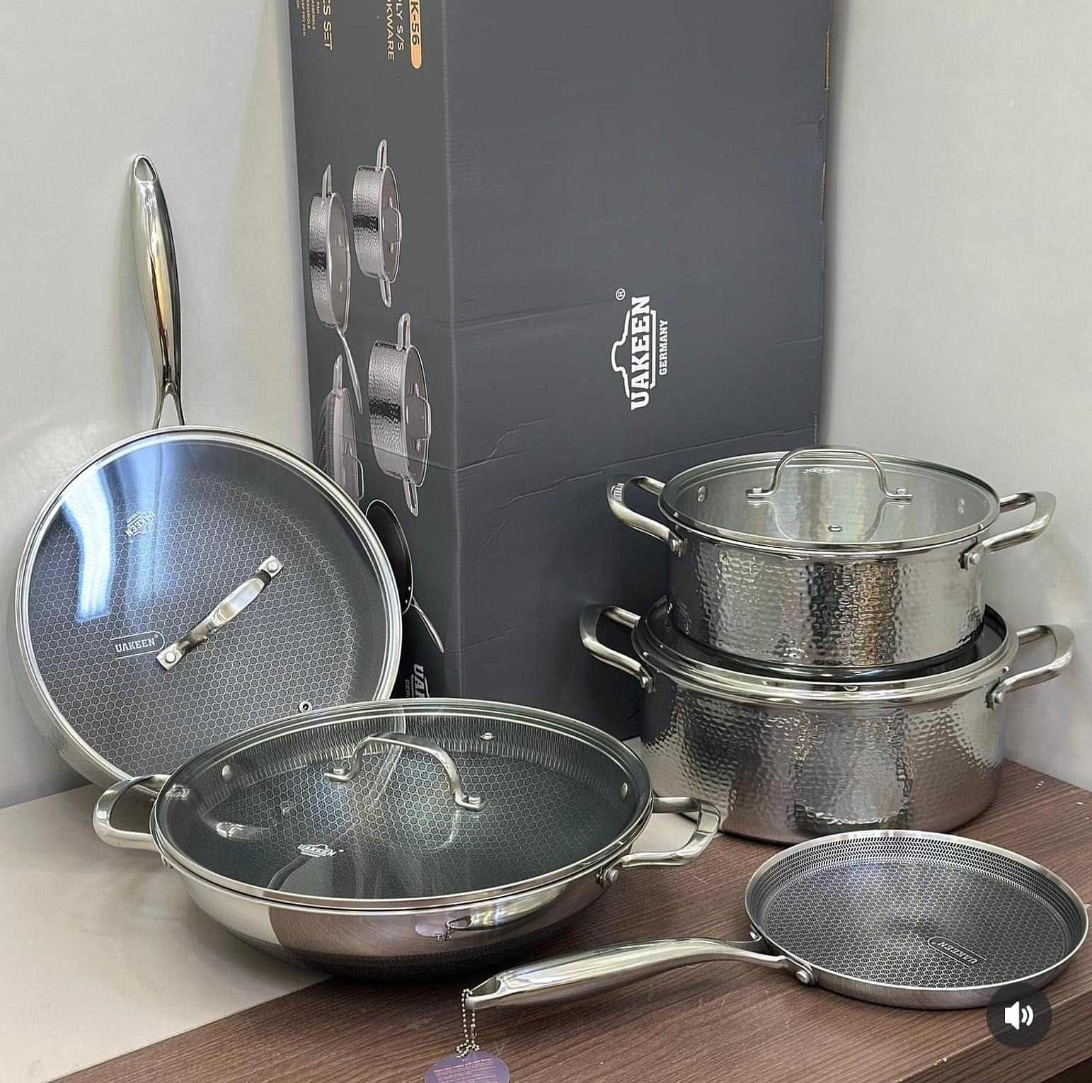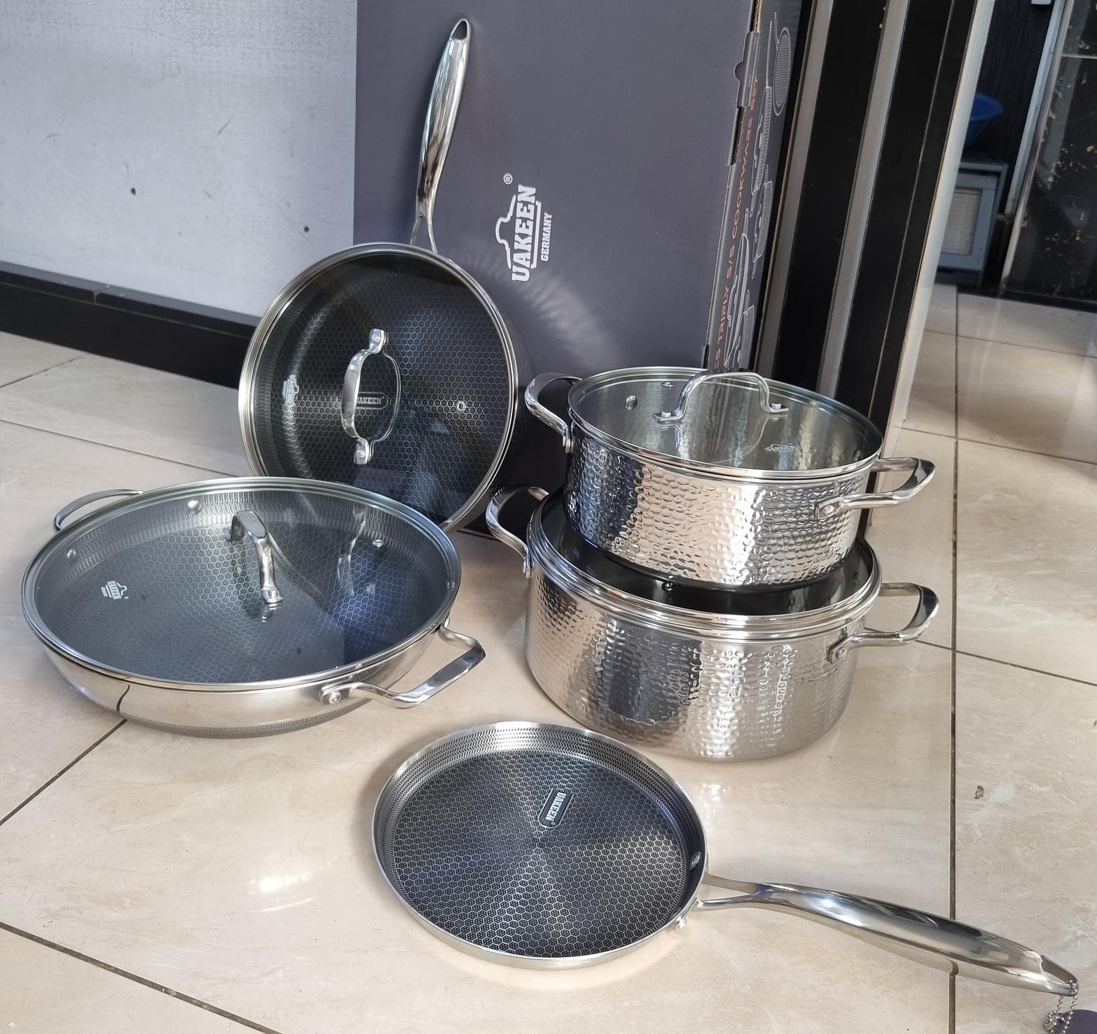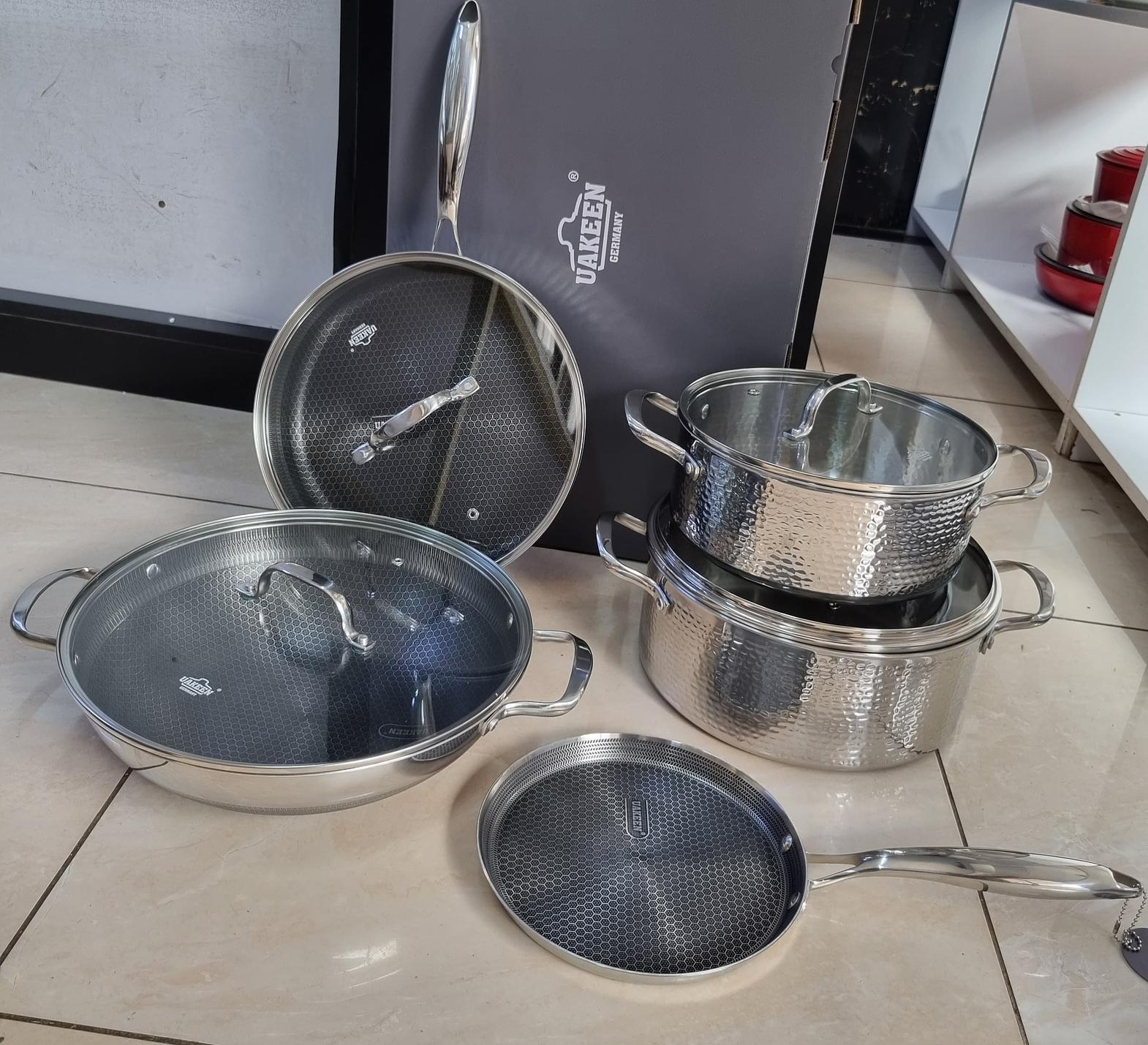 Upgrade your kitchen with the UAKEEN Stainless Steel Cookware Set, crafted from premium triply stainless steel for superior heat distribution and long-lasting performance. The elegant hammered patterned finish with a mirror polished exterior adds a luxurious touch to your kitchen.